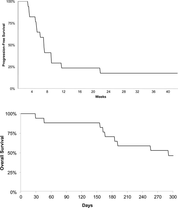 The primary endpoint for this study was the determination of the 6-month progression free survival rate (PFS6). Secondary efficacy endpoints included overall survival and objective response. Among recurrent glioblastoma patients, large meta-analyses of clinical trials evaluating a wide array of salvage therapeutics have reported PFS-6 rates of 9-11% [19-21]. This study was designed to detect a PFS-6 of >30% with an accrual of 30 subjects via a two-stage design with appropriate stopping rules for poor efficacy and unexpected toxicity. Enrollment of 30 patients yields 84% power to detect a 20% difference at an alpha level of 0.05 (one-sided). A futility interim analysis was conducted after enrollment of 17 patients using a binary endpoint PFS rate at two months (PFS-2) to determine whether the accrual should be suspended after seventeen patients had accrued.