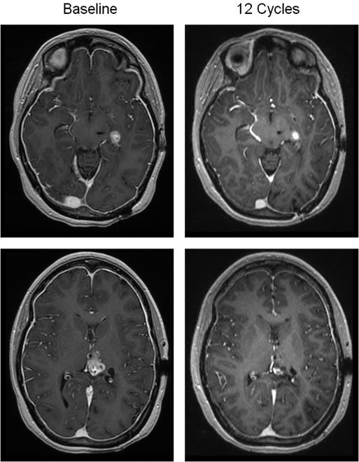 Figure 2: Objective response in a patient with recurrent glioblastoma. T1- post contrast brain MRI reveals two enhancing lesions at baseline (left top and bottom panels), which are decreased in size following 12 cycles of therapy (36 weeks; right top and bottom panels).
