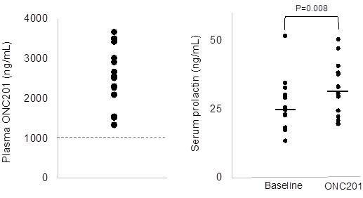 Figure 3: Correlative assays in peripheral blood. Left panel shows plasma concentrations of ONC201 at 2 hours following the first dose of ONC201. The dashed line indicates the target therapeutic threshold. Right panel shows serum prolactin levels at baseline and one day following ONC201 treatment.