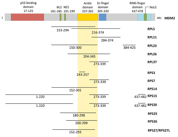 MDM2 is the best characterized negative regulator of p53. MDM2 is an E3 ubiquitin ligase that encodes a C-terminal RING domain and has multiple protein-binding domains including a p53-binding region at the N-terminus and an MDMX (also known as MDM4)-binding region through the RING domain. In addition, the acidic domain and the zinc finger domain in the central region of MDM2 have been shown to interact with a variety of regulatory factors such as the tumor suppressor p14ARF and multiple ribosomal proteins [55] (Figure 1). To date, fourteen RPs (L5, L11, L23, L26, L37, S3, S7, S14, S15, S20, S25, S26, S27, and S27L) have been shown to bind directly to MDM2 (Table 1).