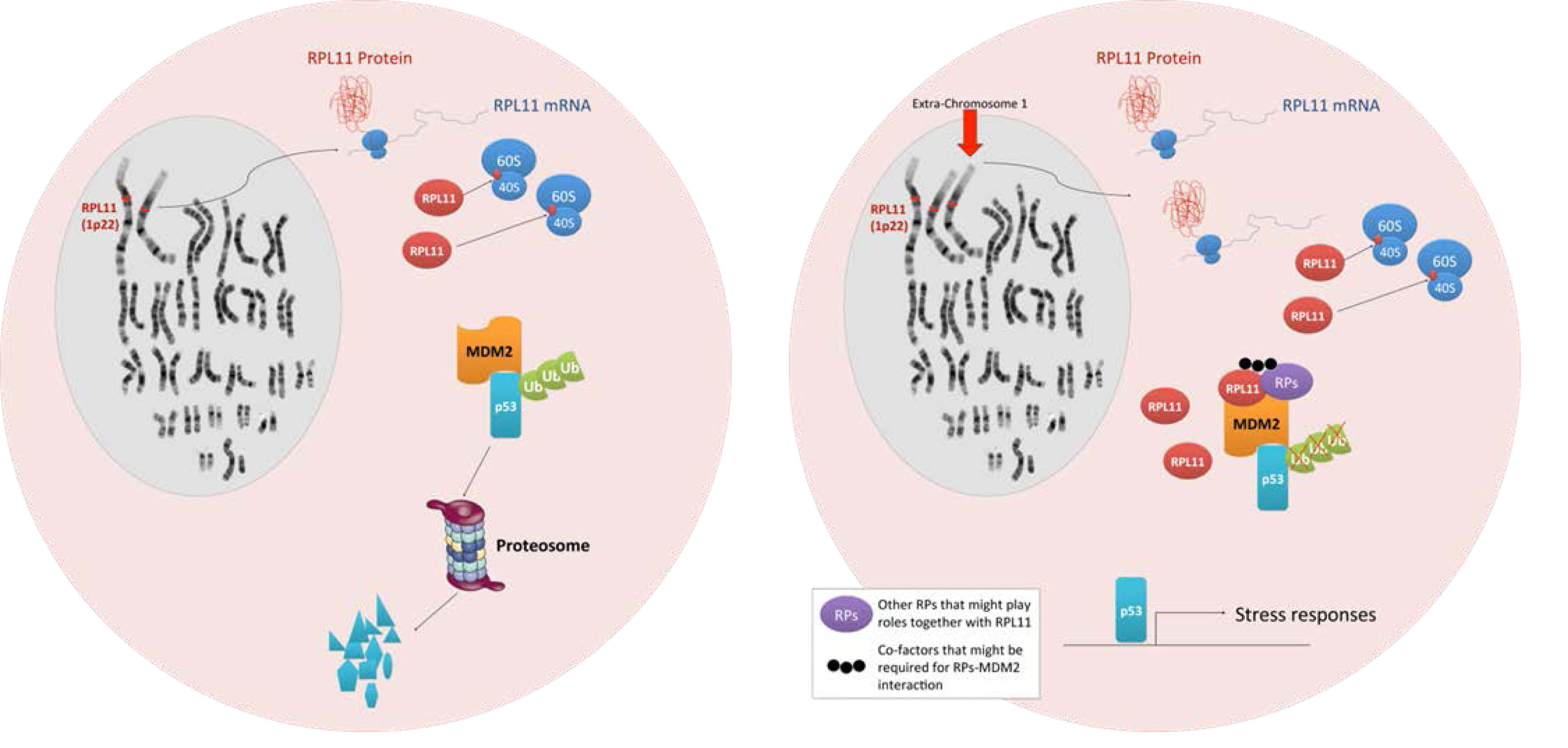Figure 2: Models depicting aneuploidy-based imbalances in RPs that result in the activation of the stress response via MDM2 binding and p53 activation. Left, a cell with a normal karyotype produces equal proportions of RPs and does not activate p53. Right, an aneuploid cell with an extra copy of chromosome 1 (indicated by an arrow) expresses a disproportionate amount of RPL11 resulting in the activation of the p53 stress response pathway.