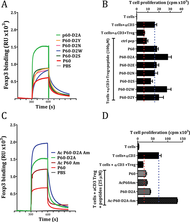Originally, P60 was identified by biopanning using a phage-displayed random 15-mer peptide library, where the peptide sequence is expressed within the phage surface protein pIII and it is flanked by other aminoacids. Thus, to mimic this situation, we tested the effect of N-terminal acetylation and C-terminal amidation on peptides P60 and P60-D2A. In both cases, these modifications improved their FOXP3-binding capacity (Figure 5C), and, in the case of P60-D2A, even improved its capacity to inhibit Treg activity. Indeed, when we tested the effect of the peptides at 25μM, which is suboptimal for P60 activity, the acetylated/amidated peptide Ac-P60-D2A-Am showed a strong capacity to improve proliferation of effector T cells in response to anti-CD3 stimulation in the presence of Treg (Figure 5D).
