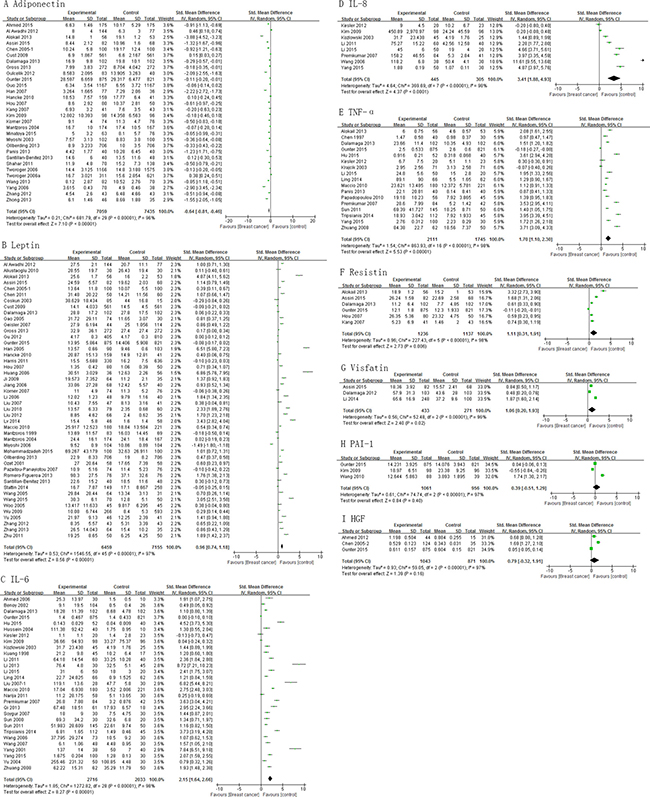 Figure 2: Association of adiponectin, leptin, IL-6, IL-8, TNF-α, resistin, visfatin, PAI-1 and HGF with breast cancer risk.