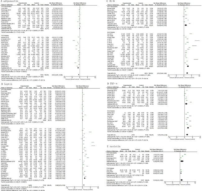While evaluating the relevance of sampling, our results show that serum levels of adiponectin, leptin, IL-6, TNF-α and resistin differed significantly between cases and controls, with a pooled SMD of -0.91 (95% CI, -1.21, -0.60; P < 0.00001), 1.20 (95% CI, 0.84, 1.56; P < 0.00001), 2.13 (95% CI, 1.62, 2.65; P < 0.00001), 1.75 (95% CI, 1.23, 2.26; P < 0.00001), and 1.48 (95% CI, 0.14, 2.82; P = 0.03), respectively (Figure 4). On the other hand, only plasma levels of adiponectin (pooled SMD, -0.23; 95% CI, -0.41, -0.04; P = 0.02), leptin (pooled SMD, 0.50; 95% CI, 0.28, 0.71; P < 0.00001) and IL-6 (pooled SMD, 2.21; 95% CI, 0.87, 3.54; P = 0.001) (Figure 4A–4C) differed significantly. Plasma levels of TNF-α and resistin did not differ significantly between cases and controls (Figure 4D–4E).