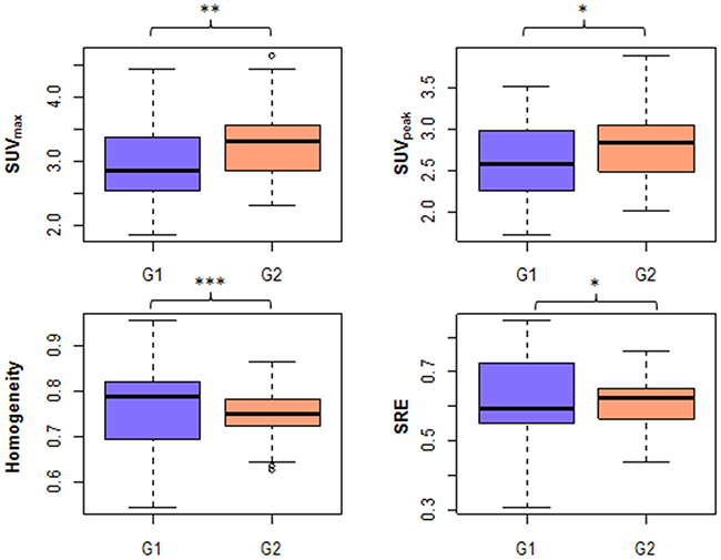 Regarding the identification of a signature for predicting recurrence, we chose to limit the number of parameters in the model by using AIC, a user-independent criterion for automatic model selection. A model containing too few parameters results in a low variance at the expense of high statistical bias for the fit parameters, whereas a model containing too many parameters may overfit the data, resulting in a low bias at the expense of high variance. We proved that a combination of a few radiomic features selected by an algorithm avoiding overlearning is predictive of treatment outcome. To our knowledge, this is the first study evaluating a combination of textural and SUV-based features computed on PET images to predict local recurrence of LACC with a validation set of images acquired on a separate device. Our results showed a difference between groups (Figure 1): the highest AUC was achieved using Entropy, SUVmean, SUVmax and SRE in G1 (AUC = 0.77), and using SUVpeak, Homogeneity, LGZE and HGZE in G2 (AUC = 0.86). Highest AUCs were reached using G2 as training set and G1 as validation set (AUC = 0.86 in G2, AUC = 0.76 in G1), and the G2 signature predicted tumor recurrence significantly better than SUVmax in both sets. These results suggest that devices characterized by higher resolution and sensitivity are more sensitive to tissue heterogeneity and lead to more precise multivariate signature of recurrence. Other parameters such as injected activity, time per bed position, field of view could have likewise influenced the radiomic signature in favor of G2 PET device. An independent validation group will be necessary to strengthen the validity of this signature, but the modernization of PET scanners and the standardization of acquisition protocols through accreditations such as the EARL (European Association of nuclear medicine Research Ltd) FDG-PET/CT proposed by the European Association of Nuclear Medicine (EANM) are encouraging for performing multi-center PET radiomic studies such as suggested by Lasnon et al. [34].