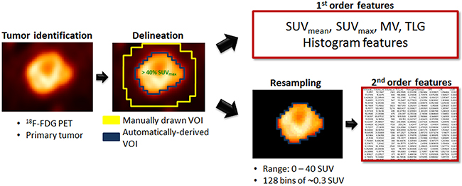 For each VOI-T, five 1st-order features were extracted: SUVmean (mean SUV in the VOI), SUVmax, SUVpeak (mean SUV in a 1 mL sphere within the VOI such that the mean SUV in that sphere was maximum), MV, and TLG (product of SUVmean and MV).
