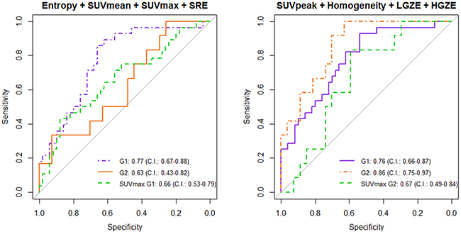 Figure 1: Multivariate analysis using G1 for training, G2 for validation (left) and G2 for training, G1 for validation (right). ROC curves of SUVmax are also presented.