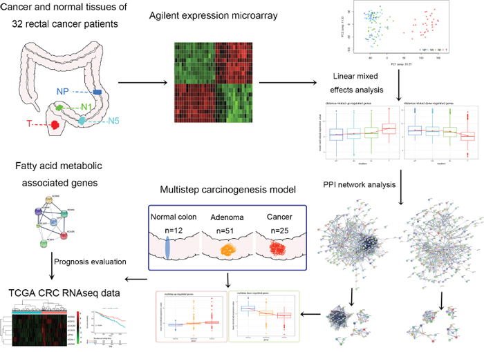 Our laboratory previously constructed a multistep carcinogenesis model comprising gene expression profiles of 12 normal colon mucosa samples, 51 adenoma biopsy samples and 25 colon adenocarcinoma samples (GSE41657). We used a linear model to identify the gradually down-regulated or up-regulated genes from the normal colon mucosa, to adenoma and cancer tissues. A FDR < 0.05 was considered statistically significant. For the cross validation, the up-regulated and down-regulated genes in both models were intersected.