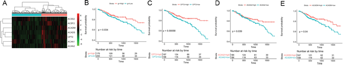 Figure 4: Five-year survival analysis of the 7 fatty acid metabolism-associated genes in the TCGA CRC dataset. (A) Hierarchical clustering of the 7 fatty acid metabolism-associated genes from the TCGA CRC dataset. The expression levels of the genes are illustrated as a color spectrum, with red, black and green representing high, medium and low expression, respectively, in a matrix indexed by genes in rows and samples in columns. The samples were divided into two groups. (B) Kaplan-Meier survival analysis and log-rank test of these 7 genes, using hierarchical clustering of their expression values as the categorical variable to divide the 375 patients into two groups. (C), (D) and (E) show the Kaplan-Meier survival curves for CPT2, ACAA2 and ACADM, respectively.