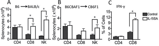 Lethally irradiated BALB/c recipients were transplanted with T cell depleted (TCD) bone marrow (BM) cells from B6 mice. IL-15SA was administered via intraperitoneal (i.p.) injection in two doses on days 17 and 24 after transplant. Animals were sacrificed on day 28. All recipients had more than 90% engraftment in the spleens and BMs. There was no significant difference in engraftment and cellularity in the spleens and BMs between IL-15SA and control groups (data not shown). Administration of IL-15SA significantly increased the number of CD8+ T and NK cells, whereas there was no change in CD4+ T cell numbers (Figure 1A). IL-15SA mostly increased CD8+ memory T cell population (CD44high) (data not shown). We observed similar activity in B6CBA→CB6F1 transplant model (Figure 1B), in which the animals were treated with the same dose and schedule. IL-15SA also augmented intracellular IFN-γ secretion by CD8+ but not CD4+ T cells in this model (Figure 1C).