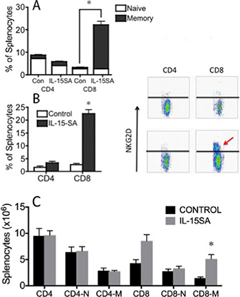 Figure 2: IL-15SA administration increases CD8+ CD44+ and CD8+NKG2D+ effector/memory T cells. Lethally irradiated (12Gy) B6D2F1 recipients were transplanted with 5 × 106 T-cell depleted (TCD) bone marrow (BM) cells from B6 mice. IL-15SA was administered via IP injection at 2.5 μg per mouse on days 28, 35 and 42. Mice were sacrificed at day 49 after transplant, and spleens were harvested. Single cell suspensions were prepared and stained with anti-H2Kd, -CD3, -CD4, -CD8, -CD44 and -NKG2D antibodies. Cells were acquired and analyzed with a flow cytometer (A and B). IL-15SA was administered via IP injection at 2.5 μg per mouse on days 35, 42 and 49. Mice were sacrificed at day 63 after transplant, and spleens were harvested. Single cell suspensions were prepared and stained with anti-H2Kd, -CD3, -CD4, -CD8, and -CD44 (C).
