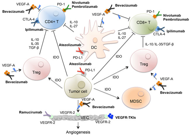 Figure 1: VEGF-A-mediated inhibition of immune response and potential combination strategy with angiogenesis inhibitors and immunotherapy. Immune checkpoint inhibitors anti-PD-1 antibidy (nivolumab and pembrolizumab) or anti-PD-L1 antibody (atezolizumab) can combine with antiangiogenic agents (bevacizumab, ramucirumab, and oral small-molecule EGFR-TKIs) for targeting tumor. VEGF-A, vascular endothelial growth factor A; PD-1, programmed cell death protein-1; PD-L1, PD-ligand 1; CTLA-4: cytotoxic T-lymphocyte-associated protein 4; TGF-β, transforming growth factor-β; IL-10, interleukin-10; IL-35, interleukin-35; IL-27, interleukin-27; Treg, T- regulatory cell; DC: dendritic cell; VEC: vascular endothelial cell; CD4+ T: cluster of differentiation 4+ T cell; CD8+ T: cluster of differentiation 8+ T cell; IDO, indoleamine 2, 3 -dioxygenase; MDSC, myeloid-derived suppressor cell; VEGFR-2: vascular endothelial growth factor receptor-2; VEGFR-TKIs: vascular endothelial growth factor receptor tyrosine kinase inhibitors.