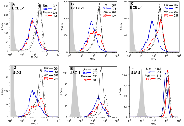 Figure 1: Effect of Tha, Len and Pom on the lytic-induced down-regulation of MHC-I in KSHV infected cells. Cells (300,000 cells/ml in 10 ml) were pretreated for 24 h with Tha, Len or Pom or DMSO vehicle control. Cells were then treated with sodium butyrate (0.3 mM) for another 24 h and then analyzed by flow cytometry for surface protein expression. Cells were washed with cold FACS buffer (10% FBS, 0.1% sodium azide in PBS) and incubated with conjugated monoclonal antibodies (2 µL) for 30 min at 4°C. After washing twice, MHC-I expression was determined by FACS. A. BCBL-1 cells pretreated for 24 h with DMSO vehicle control (Unt) or 10 µM Tha, B. 10 µM Len or C. 10 µM Pom, followed by treatment with PBS or 0.3 mM butyrate (But). T/B, L/B, and P/B indicate Tha, Len, or Pom pretreatment followed by butyrate 24 hrs later. MHC-I expression by FACS in BC-3 cells D., JSC-1 cells E., or BJAB cells F. pre-treated with DMSO vehicle control (Unt) or 10 µM Pom followed by treatment with PBS or 0.3 mM butyrate (But) 24 h before FACS analysis for MHC I expression. Results shown are representative of 3 separate experiments in A-E and 2 experiments in F. The isotype control is shown in grey shading in each Figure. Control cells (solid black line, Pom, Len or Tha treated cells (dashed black line, butyrate treated cells (blue line) and drug then butyrate treated (T/B, L/B, and P/B) (red line). The median fluorescent value is indicated within each Figure.