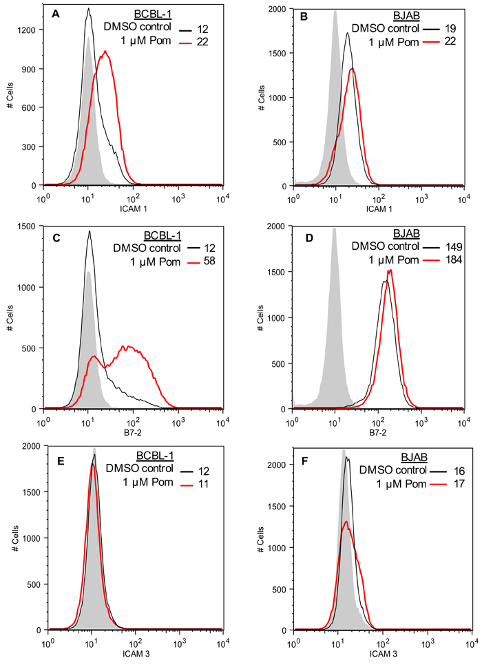 Figure 4: Effect of Len on ICAM-1 and B7-2 expression in BCBL-1 cells, effect of Pom on MHC-II expression in BCBL-1 and BJAB cells, and effect of Pom on ICAM-1 and B7-2 in JSC-1 cells. A. ICAM-1 expression and B. B7-2 expression in BCBL-1 cells pretreated for 48 h with DMSO vehicle control or Pom (1 µM) as determined by FACS. C. ICAM-1 expression D. B7-2 expression in JSC-1 cells pretreated for 48 h with DMSO vehicle control or Pom (0.2 µM) as determined by FACS. E. MHC-II expression in BCBL-1 cells or F. BJAB cells pretreated for 48 h with DMSO vehicle control or Pom (1 µM) as determined by FACS. The data is representative of two independent experiments in A, one experiment in B-D, and two experiments in E and F. The grey shading shows the isotype control.