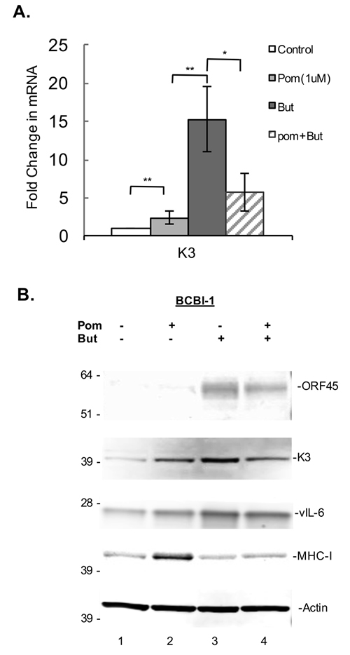 Figure 5: Effect of Pom on K3 mRNA gene expression and effects on protein expression in latent and lytic BCBL-1 cells. BCBL-1 cells were treated with control (DMSO) or Pom (1 µM) for 24 h followed by treatment with PBS or butyrate for an additional 24 h. Total mRNA was isolated and analyzed for expression levels by real time QT-PCR and was normalized to 18S levels. A. Shown is the fold changes in mRNA expression for K3, ** P < 0.01, * P < 0.05, for two tailed paired Student’s t-test. B. Immunoblot analysis of whole cell lysate protein (20 µg) for ORF45, K3, vIL-6, MHC-I of BCBL-1 cells treated with vehicle controls, Pom 1 µM, Butyrate (But) 0.3 mM, or Pom/But. Actin was run as a loading control.