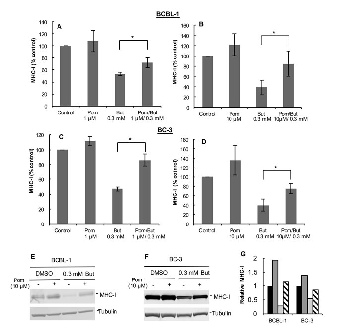 We also investigated the effect of Pom on the cytoplasmic levels of MHC-I. Cells were treated without or with 10 µM Pom for 24 h followed by treatment with 0.3 mM butyrate for 24 h. Cytoplasmic extracts were prepared and analyzed by immunoblot. Pom alone caused a discernable increase in MHC-I levels in cytoplasmic extracts of BCBL-1 and BC-3 cells even in the absence of butyrate (Figure 2E and 2F). Quantification relative to tubulin levels revealed that butyrate treatment substantially decreased cytoplasmic levels of MHC-I and this decrease was substantially prevented by pretreatment of cells with Pom (Figure 2G). In addition, this analysis showed that cytoplasmic levels of MHC-I increased over basal levels in cells with Pom alone (Figure 2G) although this effect on the cytoplasmic levels was less noticeable at 1 µM Pom (see Figure 5B).