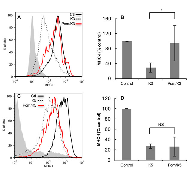 Figure 6: Effect of Pom on down-regulation of MHC-I in BJAB cells transfected with K3 or K5. FACS analysis showing the effect of GFP-K3 and GFP-K5 transfection on MHC-I down regulation in BJAB cells without or with pretreatment (48 hr) with Pom (10 µM). A. Cells were transfected with GFP plasmid control or GFP-expressing K3 and MHC-I levels were assessed 24 h after transfection on cells expressing similar levels of GFP (gated for GFP) as determined by FACS to control for protein expression levels. The grey shading shows the isotype control in A and C. Shown is a representative experiment. Median fluorescent values for DMSO control, K3, and Pom/K3 were 334, 67 and 246, respectively. B. Data compiled on the MHC-I expression in control, K3 and Pom/K3 treated cells as described above from 4 separate experiments. Median fluorescent values for DMSO control, K3, and Pom/K3 were 757, 126 and 195, respectively. C. Cells were transfected with GFP plasmid control or GFP-expressing K5 and MHC-I levels were assessed on cells expressing similar levels of GFP, shown is a representative experiment. D. Data compiled on the MHC-I expression in control, K5 and Pom/K5 treated cells as described above from 3 separate experiments. Values plotted are the mean of the median fluorescence values +/- standard deviation. Statistics comparing K3 or K5 with Pom-treated cells were performed using Student’s two tailed paired t-test, *P < 0.05.