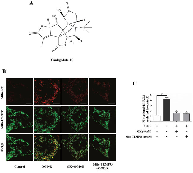 Figure 1: GK attenuates mitochondrial ROS generation after OGD/R. After treatment with GK (40 μM) or Mito-TEMPO (10 μM) for 4h, N2a cells were exposed to OGD/R. (A) GK structure. (B-C) Mitochondrial-derived ROS was measured by Mito-Sox Red using confocal microscopy. Mito-Tracker green was used to locate mitochondria. Scale bar, 5 μm. Data are expressed as mean ± SD (n = 3). *p < 0.05 vs. OGD/R; #p < 0.01 vs. untreated control.