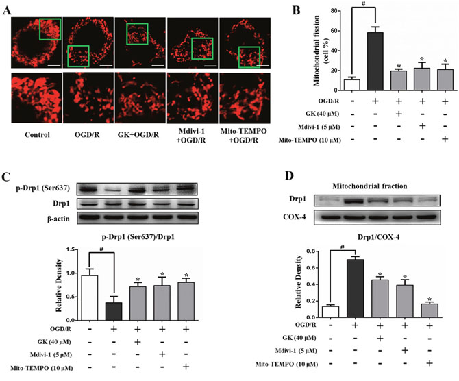 Figure 2: GK decreases mitochondrial fission after OGD/R. N2a cells were treated with GK (40 μM), Mdivi-1 (5 μM), or Mito-TEMPO (10 μM) for 4h, prior to exposure to OGD/R. (A-B) Mitochondrial fission, represented by the percentage of fragmented mitochondria, was assessed by Mito-Tracker red fluorescence using confocal microscopy. Scale bar, 5 μm. (C-D) GK, Mdivi-1, and Mito-TEMPO treatment increased Drp1 phosphorylation at Ser637 and reduced Drp1 translocation to mitochondria after OGD/R. Data are expressed as mean ± SD (n = 3). *p < 0.05 vs. OGD/R; #p < 0.01 vs. untreated control.