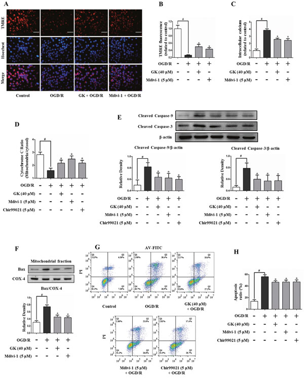 Figure 4: GK prevents mitochondrial dysfunction and apoptosis after OGD/R. N2a cells were treated with GK (40 μM), Mdivi-1 (5 μM), or Chir99021 (5 μM) for 4h prior to OGD/R. (A-B) Mitochondrial membrane potential (MMP) was measured by TMRE labeling. MMP collapsed after OGD/R injury, and GK and Mdivi-1 pre-treatment attenuated this effect. Scale bar, 50 μm. (C) Intracellular calcium increased after the OGD/R insult, and this increase was reduced in GK- and Mdivi-1-treated cells. (D) Mitochondrial cytochrome c release (quantified by ELISA) was attenuated by GK, Mdivi-1, and Chir99021 pre-treatment in cells challenged with OGD/R. (E-F) The activation of caspases 3 and 9, as well as the expression of Bax in mitochondria, were attenuated by GK exposure prior to OGD/R. (G-H) OGD/R-induced apoptosis of N2a cells was reduced by previous exposure to GK, Mdivi-1, and Chir99021. The apoptosis assay was carried by AnnexinV-FITC/PI staining and flow cytometry. Data are expressed as mean ± SD (n = 3). *p < 0.05 vs. OGD/R; #p < 0.01 vs. untreated control.