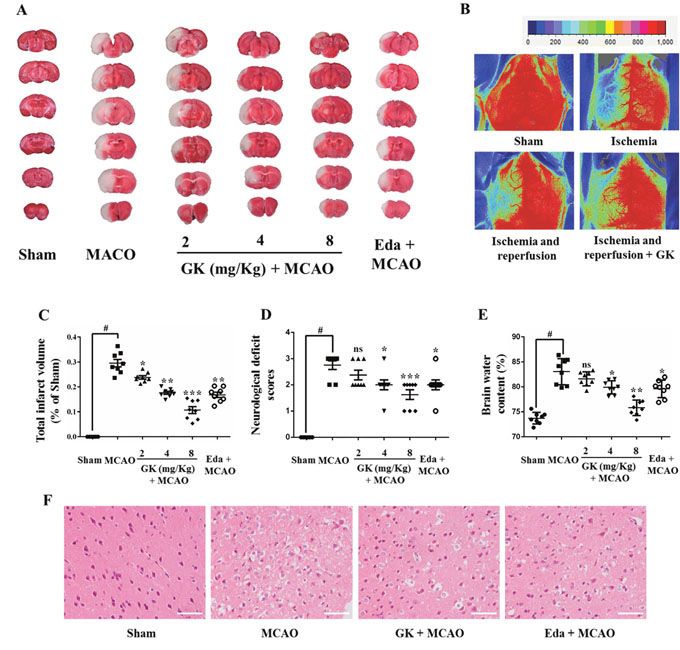 To evaluate whether GK is effective in ameliorating cerebral I/R injury, three dosages of GK (2, 4 or 8 mg/kg) were tested in mice subjected to transient middle cerebral artery occlusion (MCAO). Edaravone (10 mg/kg), a neuroprotective free radical scavenger, was used as positive control. Results showed that GK dose-dependently improved brain deficits in brain infarct volume, neurological function, and brain water content (Figure 5A, 5C, 5D, and 5E). Also, Laser-Doppler flowmetry showed that cerebral blood flow (CBF) was restored by GK treatment (Figure 5B). Notably, the benefits of GK at the 8 mg/kg dose were even greater than those observed with edaravone.
