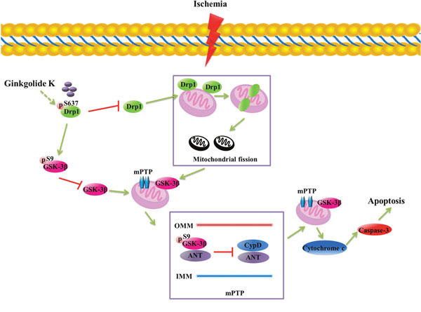 In summary, we propose that GK has a dual role in neuronal protection after I/R injury by inhibiting mitochondrial fission via phosphorylation of Drp1 (Ser637), and attenuating mPTP opening in a GSK-3β-dependent manner in neurons (Figure 7). Our data provides evidence that Drp1 and GSK-3β may be important factors in mPTP opening after cerebral I/R injury, and GK administration may significantly attenuate AIS sequelae.
