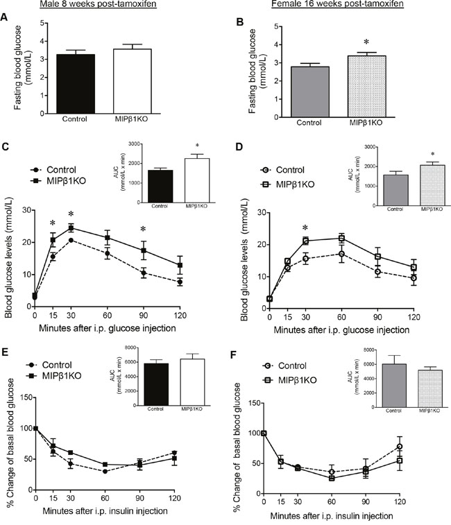 Figure 2: MIPβ1KO mice show impaired glucose metabolism. Fasting blood glucose of control and MIPβ1KO mice after 8 (male, A) or 16 (female, B) weeks post-tamoxifen. IPGTT (C, D) and IPITT (E, F) analyses, and their corresponding AUC, for control and MIPβ1KO mice. Data are expressed as mean ± SEM (n = 3-8/group). *p<0.05 vs. control group.