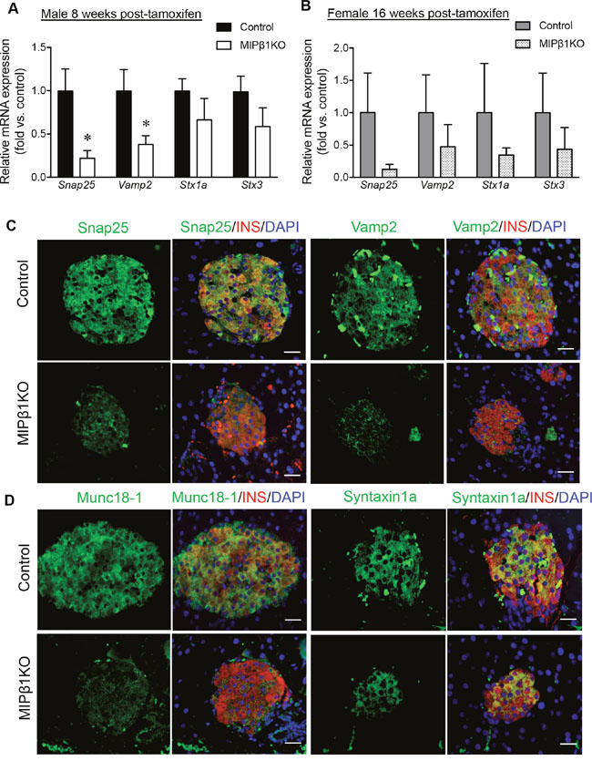 Figure 4: Reduced insulin exocytotic machinery in MIPβ1KO mice. Relative mRNA expression of Snap25, Vamp2, Stx1a and Stx3 in male (A) and female (B) control and MIPβ1KO mice 8 or 16 weeks post-tamoxifen. Data are expressed as mean ± SEM (n = 3-4/group). *p<0.05 vs. control. (C, D) Representative immunofluorescence staining images for Snap25, Vamp2, Munc18-1 and Syntaxin1a (green) with insulin (red) in male control and MIPβ1KO mice. Nuclei were labeled using DAPI (blue) (n=3/group). Scale bar: 25μm.