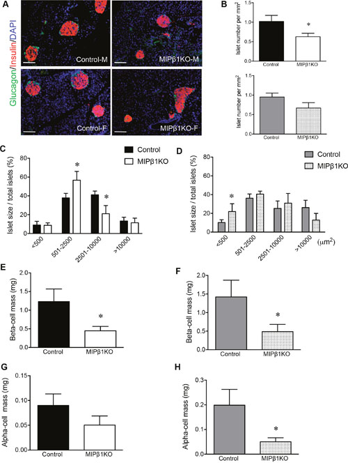 Immunofluorescence staining of MIPβ1KO and control pancreata showed that the overall architecture of the pancreas was unaltered, with intact islets and a normal distribution of insulin+ and glucagon+ cells observed (Figure 6A). Islet density (islets per mm2) was significantly reduced in male MIPβ1KO pancreata (p<0.05), while relatively lower islet density was observed in female MIPβ1KO pancreata compared to the controls (Figure 6B). Male MIPβ1KO mice demonstrated a significantly higher percentage of smaller islets (<2,500μm2) and a lower number of large islets (<10,000μm2; p<0.05, Figure 6C). Female MIPβ1KO mice also showed a higher percentage of the smallest islets (<500μm2) and a low number of the largest islets (>10,000μm2) when compared to control mice (p<0.05, Figure 6D). The decrease in larger islets was accompanied by significantly reduced beta-cell mass in both male and female MIPβ1KO mice (p<0.05, Figure 6E-6F). Reductions in alpha-cell mass were observed in female (p<0.05, Figure 6H), but not male (Figure 6G), MIPβ1KO pancreata.