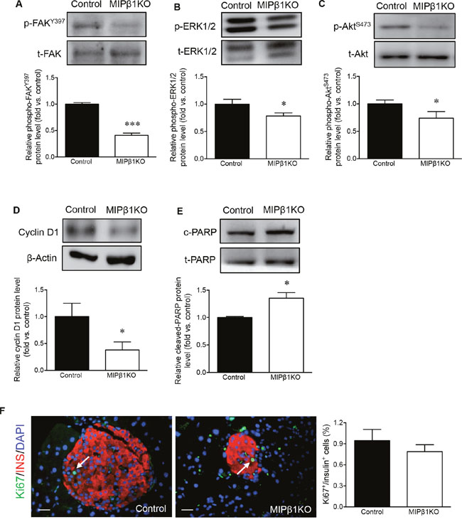 FAK, ERK1/2, and Akt are downstream signaling molecules of β1 integrin that have been shown to regulate beta-cell proliferation, survival, and function [4, 12, 14, 17]. There was a significant reduction in p-FAKY397 (p<0.001, Figure 7A) and p-ERK1/2 (p<0.05, Figure 7B) in male MIPβ1KO mouse islets compared to controls. A significant decrease in p-AktS473 was also observed in male MIPβ1KO islets (p<0.05, Figure 7C). Protein levels of the proliferative marker cyclin D1 were found to be significantly reduced in male MIPβ1KO mouse islets compared to controls (p<0.05, Figure 7D), and a significant increase in the apoptotic marker cleaved-Poly (ADP-ribose) polymerase (c-PARP) was also evident in male MIPβ1KO islets (p<0.05, Figure 7E). The percentage of Ki67+ beta-cells in male MIPβ1KO islets was also relatively lower than that of controls (Figure 7F).