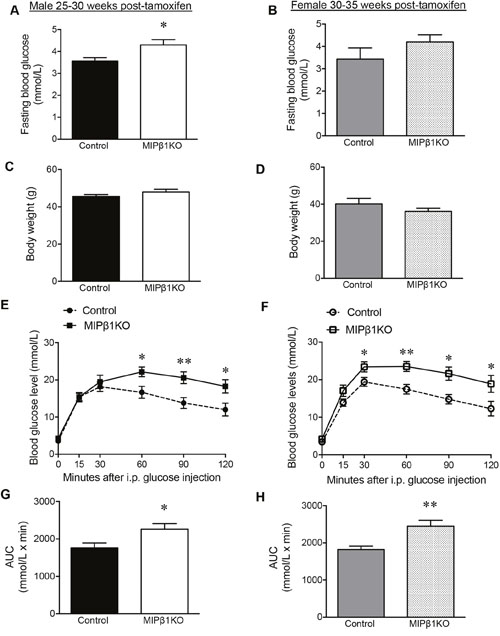 Figure 8: Impairment of glucose metabolism in aged MIPβ1KO mice. Fasting blood glucose and body weight of aged male (A, C) and female (B, D) control and MIPβ1KO mice. IPGTT analysis of aged control and MIPβ1KO male (E) and female (F) mice, and corresponding AUC (G, H). Data are expressed as mean ± SEM (n=6-14/group). *p<0.05, **p<0.01 vs. control.
