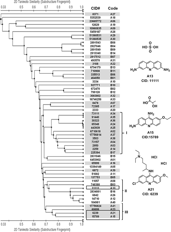 We employed a chemical structure clustering tool, a free online service from PubChem, to access the structure similarity of our hits. Tanimoto coefficient was used to quantify the structure similarity, which is by far the most popular and in widespread use today in computational medicinal chemistry [32]. Structural similarity clustering of 58 hits by a Tanimoto distance of 0.3 resulted in 29 different clusters and singletons. Three major clusters were revealed (Figure 2). We found that some compounds in cluster I might be promiscuous, assay-duping molecules. They have the common structure of polyhydroxy naphthalene or anthraquinone, therefore can be considered as pan-assay interference compounds, or PAINS [33]. After carefully looking over the hit structures, three acridine analogues, A13, A15 and A21, from cluster II and cluster III were subjected to further analysis (Figure 2).