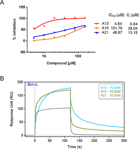 Figure 3: Validation of compounds A13, A15, and A21 binding to Bcl-xL protein. (A) Dose-response curves of acridine compounds disrupting Bcl-xL-20-mer complex in FP assay using 2.5 μM Bcl-xL protein and 400 nM fluorescein-labeled Beclin 1 BH3 peptide (20-mer). (B) SPR sensorgram of acridine compounds confirmed their binding abilities to immobilized Bcl-xL protein at the concentration of 10 μM. Bcl-xL protein was immobilized on the sensor chip with 10000 RU.