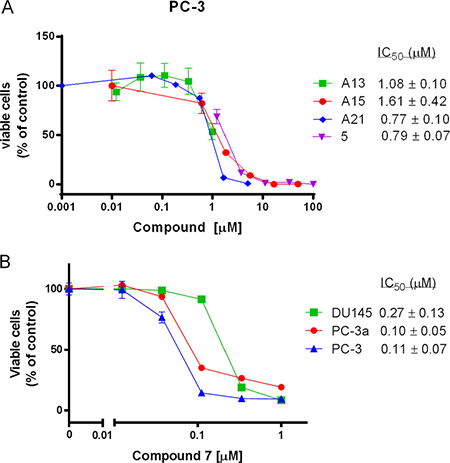 Figure 4: The growth inhibitory effects of several acridine compounds in vitro. (A) Compounds A13, A15, A21, and 5 inhibit PC-3 prostate cancer cell growth in a dose-dependent manner. (B) The cytotoxicity of compound 7 against DU145, PC-3a and PC-3 cancer cell lines.