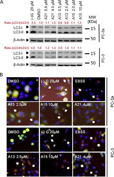 Figure 5: Acridine compounds induce autophagy in prostate cancer cells. (A) LC3-II conversion in western blot analysis indicated the activity of autophagy. Cells were treated with DMSO or compounds for 24 h, and then lysed and processed for western blot analysis of LC3. (–)G and EBSS were used as positive controls. (B) RFP-GFP-LC3 puncta (indicated by white arrows) in cells after treatment suggested the induction of autophagy. Yellow puncta indicate autophagosome (overlay of red and green fluorescence); red puncta indicate autolysosome (due to green fluorescence quenching at the acidic condition). Cells expressing RFP-GFP-LC3 were treated with compounds A13, A15 or A21 at indicated concentration for 24 h.