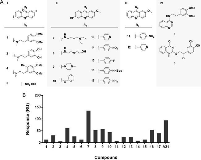 Figure 6: Analysis of structure-activity relationship of A21 derivatives. (A) The chemical structures of acridine derivatives. (B) The maximal binding levels of acridine analogues to Bcl-xL protein at a concentration of 10 μM were tested using SPR. The compounds showed different binding ability to Bcl-xL protein.