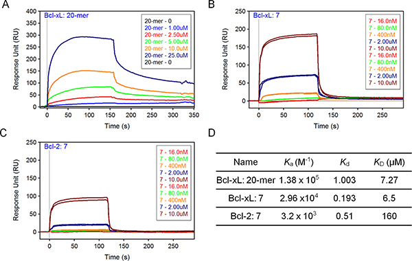Figure 7: SPR analysis of compound 7. (A, B, C) SPR binding curves, or sensorgrams, for Beclin 20-mer peptide to immobilized Bcl-xL (A), compound 7 to Bcl-xL (B) and compound 7 to Bcl-2 (C). Sensorgrams representing direct binding kinetics for analytes are shown in response unit (RU) as a function of time (second) with increasing concentration (0.016–10 μM for 7; 1–25 μM for 20-mer). (D) The association rate (Ka), dissociation rate (Kd) and equilibrium dissociation constant (KD) were listed. KD was determined by Kd/Ka.