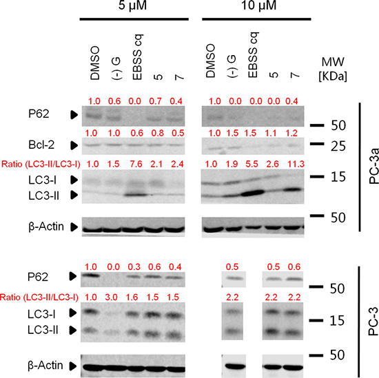 We next tested the effects of compound 7 on the autophagy pathway using western blotting. In addition to LC3 conversion, SQSTM1/P62 turnover can also be an important marker for assessing the autophagic flux [34]. Compound 7 triggered the conversion of LC3-I to LC3-II and the degradation of P62 in PC-3 and PC-3a cells, indicating its ability to induce autophagy (Figure 8).