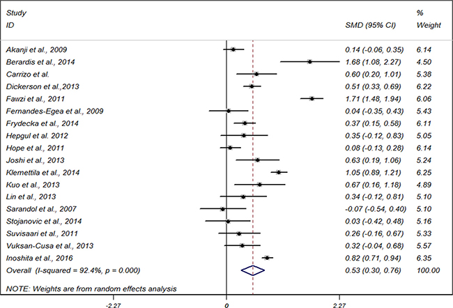 Subgroup analysis stratified by age indicated that serum and plasma CRP levels were increased significantly in studies with participants’age <30 years (n = 5, pooled SMD 0.76, 95% CI 0.07 to 1.58); but moderately in studies with participants’age ranging from 30 to 50 years (n = 11, pooled SMD 0.43, 95% CI 0.19 to 0.67); similar results were also obtained for studies with participants’age ≥ 50 years (n = 2, pooled SMD 0.58, 95% CI 0.03 to 1.12). We found statistically significant difference for inter-study heterogeneity (P < 0.001).