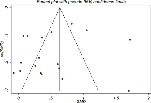 Sensitivity analysis showed that serum and plasma CRP levels were increased moderately in studies involved only high-sensitivity CRP assay (n = 17, pooled SMD 0.56, 95% CI 0.33 to 0.80). No significant funnel plot asymmetry was detected as was shown in Figure 3, indicating no publication bias, which was further confirmed by Begg’s rank correlation test (P = 0.544) and Egger’s regression test (P = 0.292). Duval and Tweedie’s trim and fill method indicated that no missing study was inputed and the adjusted SMD was the same as the primary one, confirming the robustness of the analysis.
