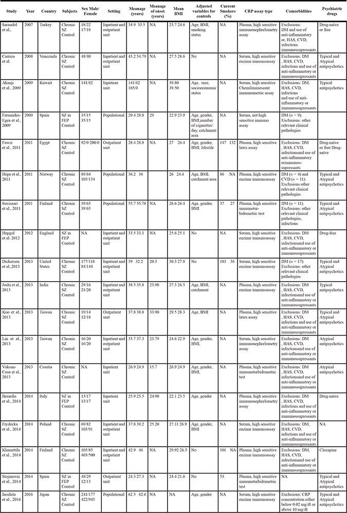 Two authors (Z.W. and P.L.) independently searched, identified the related studies, extracted data and evaluated the study quality. When discrepancies occured, a third author (G.C.) made the definitive decision for study eligibility and data extraction. We extracted the following data including first author, publication year , research country, study subjects, clinical setting, sex, age and BMI of the study subjects, age of SZ onset, adjusted variables for controls, percent of the current smokers, CRP assay type, comorbidities and psychiatric drugs used. If necessary, we consulted the original data from the authors of the studies to collect missing information. The Newcastle–Ottawa Scales (NOS) was used to assess quality of the included studies [47], which applied three domains for assessment and allocated a total score of nine points. Quality categories were determined by the NOS score of each study. We defined that the score of high quality with 7 or more, medium quality from 4 to 6 and low quality less than 4.