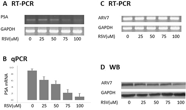 Figure 2: RSV inhibits ARV7 transcriptional activity by downregulating ARV7 protein levels. PC-3 cells were transiently transfected with plasmid expressing ARV7 and treated with different concentrations (0–100 μM) of RSV for 24 hours. Both RT-PCR (A) and qPCR (B) were conducted to estimate the effect of RSV on the mRNA levels of PSA; RT-PCR and WB were conducted to estimate the levels of ARV7 mRNA (C) and protein (D).