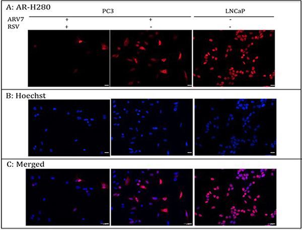 Figure 3: PC-3 cells were transiently transfected with plasmid expressing ARV7 and treated with or without RSV for 24 hours. LNCaP cells were treated with 10 nM R1881 for 24 hours. Immunostaining was conducted to determine the subcellular localizations of AR and ARV7. Scale bar: 100 μm.