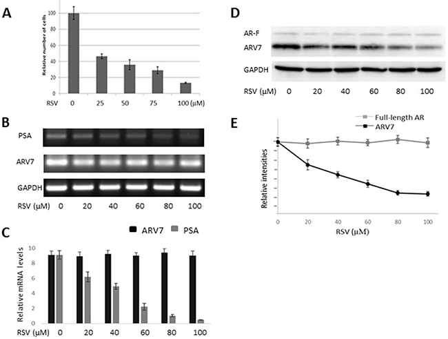 Figure 4: RSV inhibits prostate cancer growth and downregulates ARV7 in 22RV1 cells without affecting full-length AR. 22RV1 cells were treated with different concentrations (0–100 μM of RSV for 24 hours and the number of viable cells were estimated through cell counting (A). The mRNA levels of PSA and ARV7 were estimated by RT-PCR (B) and q-PCR (C). The protein levels of ARV7 and full-length AR were estimated by western blotting assays (D and E).