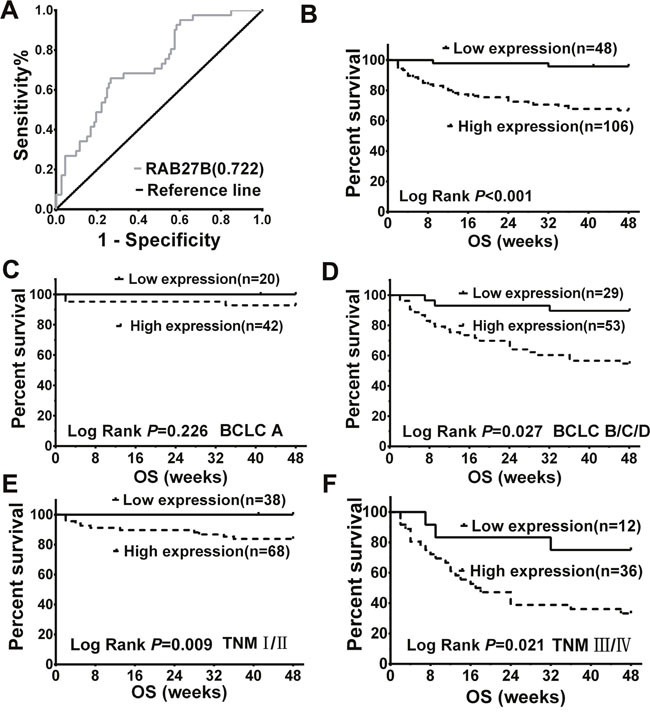 RAB27B expression was also analyzed according to the BCLC stages of patients with HCC. Results revealed that patients with higher serum levels of RAB27B had a significantly poorer prognosis at BCLC stage BCD (p= 0.027, Figure 2D). For patients in BCLC stage A, the correlation between RAB27B expression and prognosis was not prominent (p = 0.226, Figure 2C). Moreover, analysis was carried out based on the RAB27B expression and OSTs of patients with HCC according to patients’ TNM grades. K-M survival analysis revealed that patients with higher expression of RAB27B tended to have a poorer prognosis both in TNM I-IIand III-IV grades (p = 0.09, p = 0.021, Figure 2E and 2F).