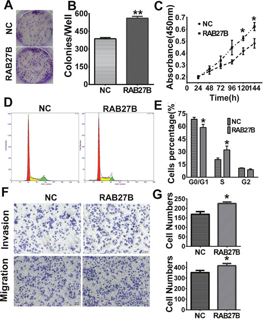 Figure 5: Upregulation of RAB27B promotes proliferation, migration, invasion and G1/S transition in HuH-7 cells. (A, B) After transfection with Negative Control (NC)/RAB27B plasmids for 24 h, HuH-7 colony formation ability was increased remarkably, and (C) in MTT assays, cell proliferation was significantly improved after transfection for 120 hours. (D, E) Cell cycle analysis also revealed that the number of cells in S phase was greatly increased in RAB27B-transfected cells compared to negative control (NC) cells, whereas cells in G0/G1 stages were greatly decreased. (F, G) After transfection with NC or RAB27B plasmids, cell migration and invasion ability were detected in HUH7 cells. *p < 0.05, **p < 0.01, ***p < 0.001.