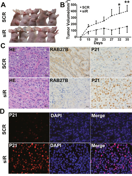Figure 7: RAB27B downregulation inhibits tumor growth in vivo. (A, B) The right upper sub-axillary of BALB/C nude mice was subcutaneously transplanted with BEL7402 cells transfected with GFP-SCR or siR plasmids (n = 6). Thirty-five days after implantation, RAB27B deficiency inhibited tumor growth in nude mice. The volume of the tumors was calculated and are presented as the mean±S.E.M. (C) H&E staining is shown in the left panel (400 × magnification). RAB27B and p21 expression in tumor tissues were detected by immunohistochemistry (400 × magnification). (D) Expression and intracellular localization of p21 was analyzed in tumor tissues by immunofluorescence (400 × magnification). *p < 0.05, **p < 0.01.