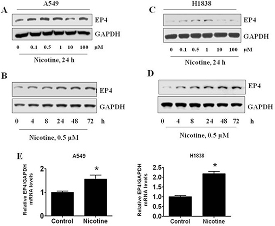 Figure 2: The effects of nicotine, acetylcholine, and acetylcholinesterase on EP4 expression in human lung carcinoma cells. (A) Nicotine increased the expression of EP4 in dose-dependent manner in A549 cells. (B) Nicotine increased the expression of EP4 in time-dependent manner in A549 cells. (C) Nicotine increased the expression of EP4 in dose-dependent manner in H1838 cells. (D) Nicotine increased the expression of EP4 in time-dependent manner in H1838 cells. E. Nicotine increased EP4 mRNA expression as determined by real time RT-PCR. GAPDH served as internal control for normalization purposes. *indicates significant differences from control (P < 0.05).