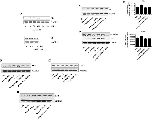 Figure 3: Involvements of α7 nAChR, and PI3K, JNK and PKC pathways in the induction of EP4 by nicotine. (A) Acetylcholine increased the expression of EP4 induced by nicotine in dose-dependent in A549 cells. (B) Acetylcholinesterase decreased the expression of EP4 induced by nicotine in dose-dependent in A549 cells. (C) a-bungarotoxin of a a7 nAChR blocker, not dihydro-β-erythroidine of a α4 nAChR inhibitor, decreased the expression of EP4 induced by nicotine in A549 cells. (D) α7 nAChR siRNA (100 nM) decreased the expression of EP4 induced by nicotine in A549 cells. (E) a-bungarotoxin, a a7 nAChR blocker, decreased the proliferation induced by nicotine in A549 cells and H1838 cells. (F) The specific inhibitors of PI3-K (wortmannin, 1 μM), JNK (SP600125, 20 μM) reduced expression of EP4 induced by nicotine in A549 cells. (G) The specific inhibitors of ERK (PD98095, 20 μM), not P38 MAPK (SB239063, 10 μM) had a minor effect on reduction of EP4 induced by nicotine in A549 cells. (H) The specific inhibitors of PKC (calphostin C, 0.5 μM), not PKA (H89, 10 μM) reduced expression of EP4 induced by nicotine in A549 cells. GAPDH served as internal control for normalization purposes.