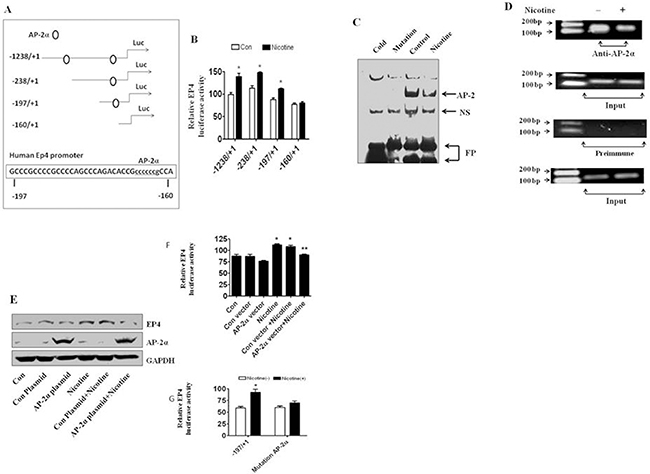 Figure 4: Nicotine stimulates EP4 promoter activity and affects AP-2α binding activity. (A) The 5′-flanking region of the human EP4 gene wild type and deletion promoter constructs schematics are presented. These regions contain several transcription factor binding sites including AP-2. (B) Nicotine increased EP4 gene promoter activity in A549 cells, transfected with the full-length wild-type EP4 promoter (–1238/+1) luciferase reporter construct and other two EP4 deletion reporter constructs (–238/+1 and –197/+1), not with a shortest EP4 deletion reporter construct (–160/+1). (C) Nicotine decreased the binding ability of AP-2α to the Oligonucleotides which contains the AP-2α site. (D) Nicotine decreased the EP4 promoter DNA quantity binding to AP-2α protein. (E) AP-2α overexpression vector blocked nicotine-induced EP4 protein expression in A549 cells. (F) AP-2α overexpression vector blocked nicotine-induced promoter activity of EP4 in A549cells. (G) Site-directed mutation of AP-2α (–169 bp ) on EP4 promoter blocked nicotine-induced promoter activity of EP4 in A549cells. *indicates significance as compared with controls. **indicates significance of combination treatment as compared with nicotine alone (P < 0.05). Con, untreated control cells.